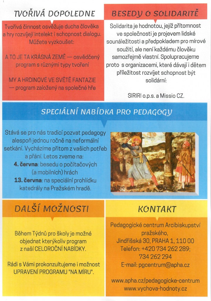 Podrobné informace a přihlašovací formulář jsou k dispozici na webových stránkách: www.vychova-hodnoty.cz/tydny-pro-skoly-2019.