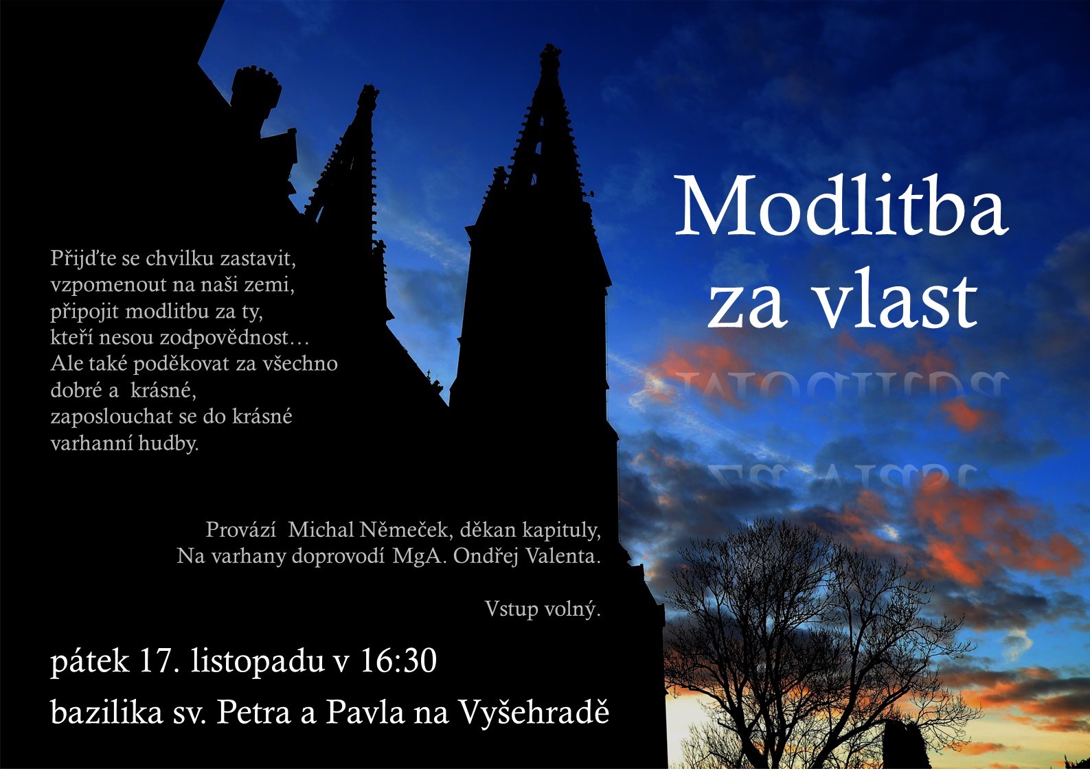 06.11.2023 | Zveme v den výročí Sametové revoluce k modlitbě za naši zemi v 16:30 do baziliky na Vyšehrad. Varhanní hudba, krátké slovo, modlitba a ticho.