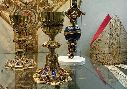 Vyšehradští preláti nejpozději od 14. století dělili umělecké objednávky mezi kapitulu, své vlastní fundace a své soukromé sbírky. Mimořádné úctě se těšily relikvie světců v drahocenných relikviářích, z nichž se dochovalo torzo jednoho stříbrného ostensoria.