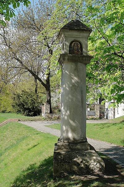 Naproti objektu rotundy sv. Martina jsou umístěna boží muka (morový sloup) z roku 1714 zbudovaná na připomínku morové rány 1713-1714. Na nízkém hranolovém soklu stojí robustní válcový sloup s římsovou hlavicí nesoucí hranolovou kapličku s kamennou stříškou. Boky kapličky jsou vybrány polokruhem zaklenutými mělkými nikami, v nichž jsou umístěny novodobé skleněné mozaiky s portréty českých patronů (pořízeny 1938). Na vrcholu stříšky je zakotven dvouramenný kovový zlacený kříž.