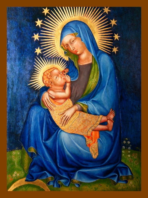 The image depicts the Virgin Mary with a halo of twelve stars around her head, wrapped in a plain blue cloak, with her right foot resting on a crescent moon. The baby Jesus is wrapped in a richly decorated cloth, suggesting his royal origin. Presumably in 1397, the painting was provided with a silver cover with a cut-out following the outline of the Madonna and Child’s body. The decorative silver clip on Mary’s garment contained a precious relic – a piece of Mary’s cloak or veil. The painting was therefore venerated as a reliquary.
